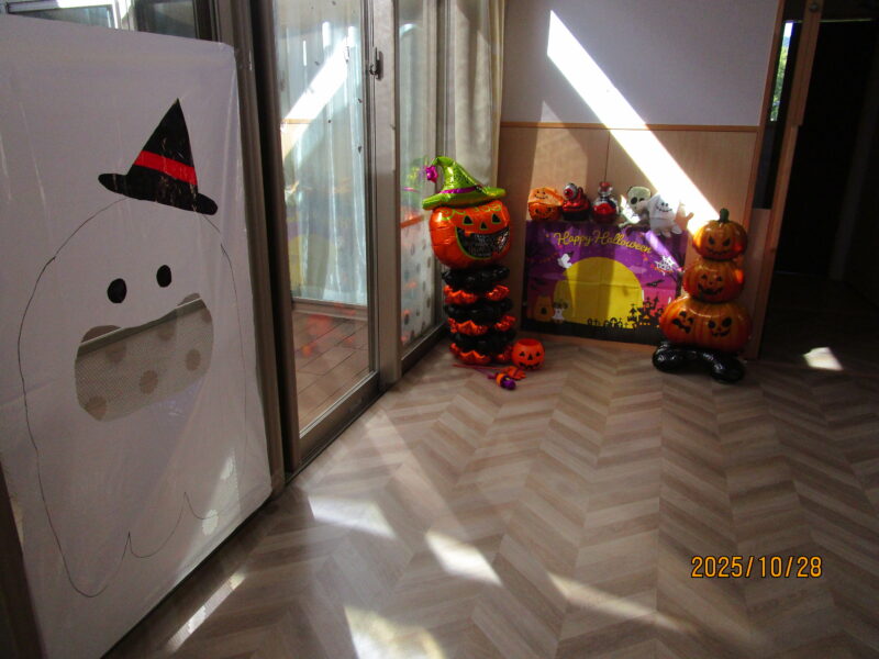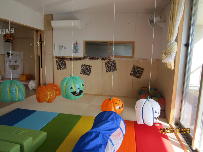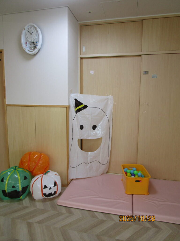 いよいよ当日。カボチャオバケや黒猫ちゃん、ディズニーのキャラクターなどいろんなものに大変身。自分の姿を鏡で見て喜ぶ子もいれば、いつもと違うお友達にびっくりしてしまう子もいましたが、行事が始まるとペープサートの【おばけなんてないさ】をじっくり見て準備されていたアスレチックで思いっきり体を動かして、フォトスブースで写真撮影をするなど楽しいひと時を過ごしました。また、装飾はカラービニール袋を使った大きなカボチャが廊下や居室のいたるところにあり、天井からつるされているのを発見するとパンチを決めたり、優しく押してゆらめくのを楽しんだりしながら、最後に記念の手作りメダルとお菓子ももらって大満足。