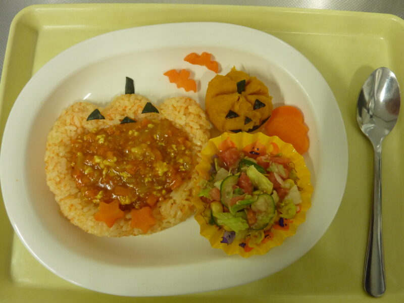 「トリックオアトリート」とはなかなかうまく言えませんが、お兄ちゃんお姉ちゃんたちは一生懸命「トリットット‥‥」と言おうとして最後には「お菓子ちょうだい」と可愛くおねだりしていました。その日の夕食は、カボチャをかたどった特性カレーライス。そして31日のおやつはハロウィンマフィン。行事が終わってからもすぐに楽しかったハロウィン行事の写真が廊下に飾られ「ハロウィンしたねえ」「○○ちゃんねこちゃんみたい」と振り返って沢山お話をするなど、装飾や行事、美味しい食事や写真など色々な場面でハロウィンを満喫する一週間になりました。