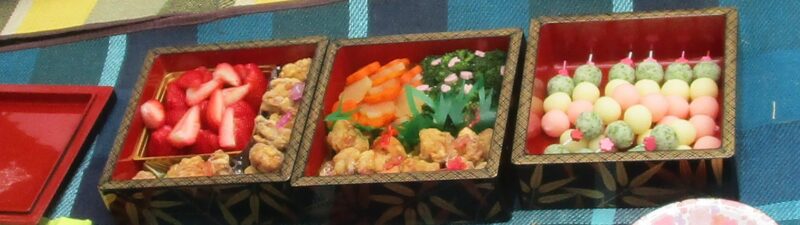 敷物を広げていただくお花見メニューは、子どもたちが大好きな おにぎりと焼きそば、唐揚げ、いちご、そしてなんと…じゃがいもで作った三色団子も登場!素敵♡